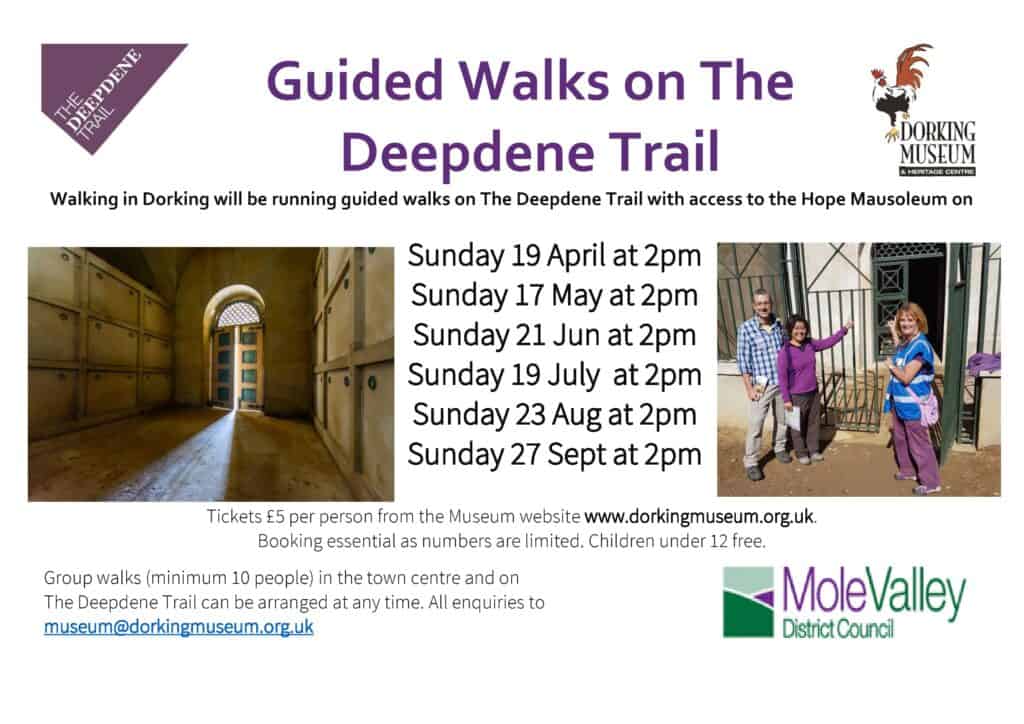 Well behaved dogs on leads are very welcome on these walks. Hot drinks and snacks are available from Dorking Golf Club at the end of the walk. Please note – no physical tickets will be issued, please meet your guide at Dorking Golf Club 10 minutes before the start of your tour which will begin promptly. Please wear sensible footwear. The walk is not weather dependant, so do wear appropriate clothes.